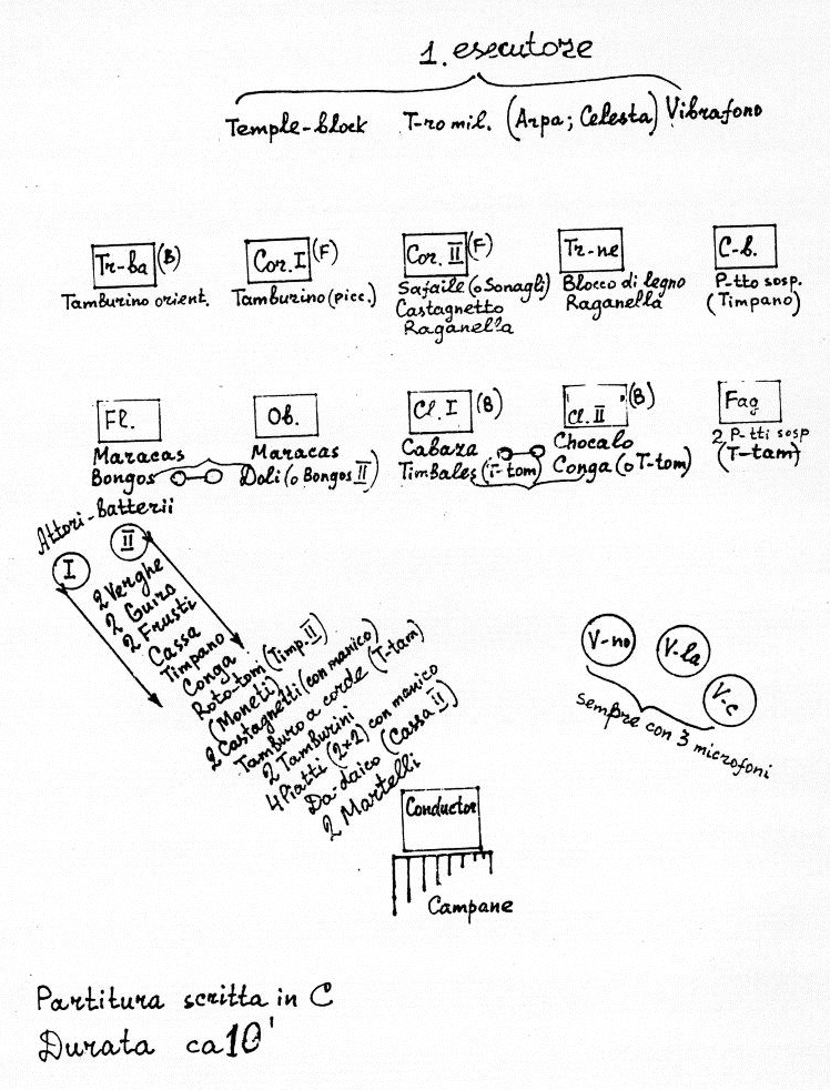 Orch: 1(=Picc,=AFl).1(=EHrn).2(I=Picc,II=BCl).1(=CBsn). – 2.1.0.0. – 3Perc — Pf(=Cel) – Tape – Narrator –12.0.6.6.4.